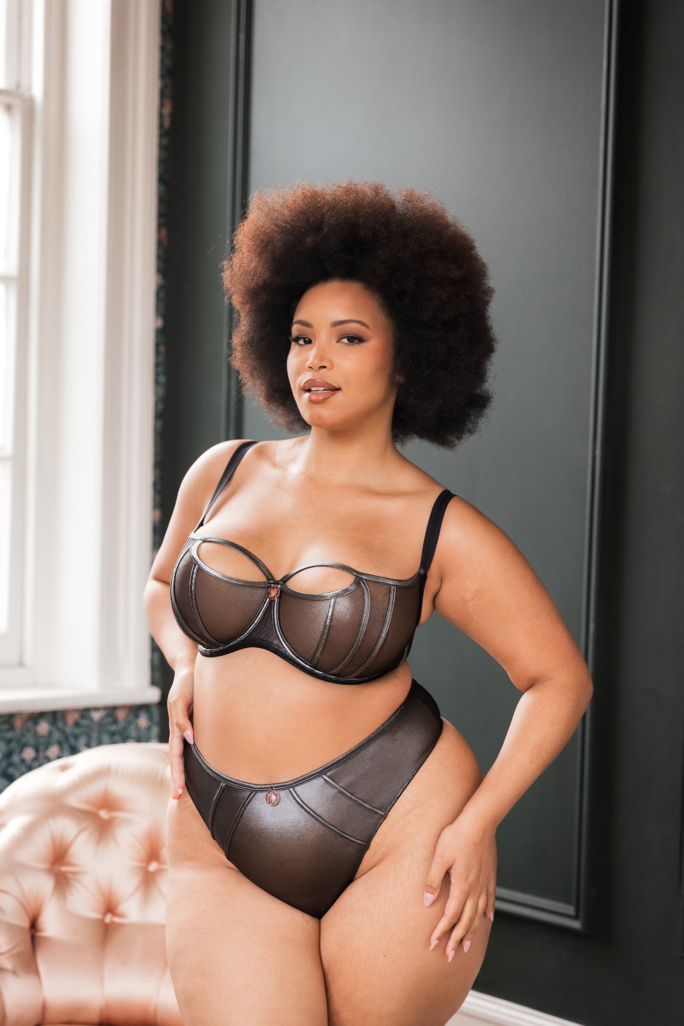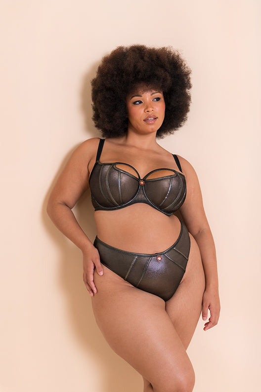 Shimmering in our signature rose gold, the foil-printed metallic Eos balcony bra honours ‘Eos’ the goddess of the dawn, with bespoke designed branded sun-flare metal charm, delicate cut-out windows & enhanced style lines in foiled detail.