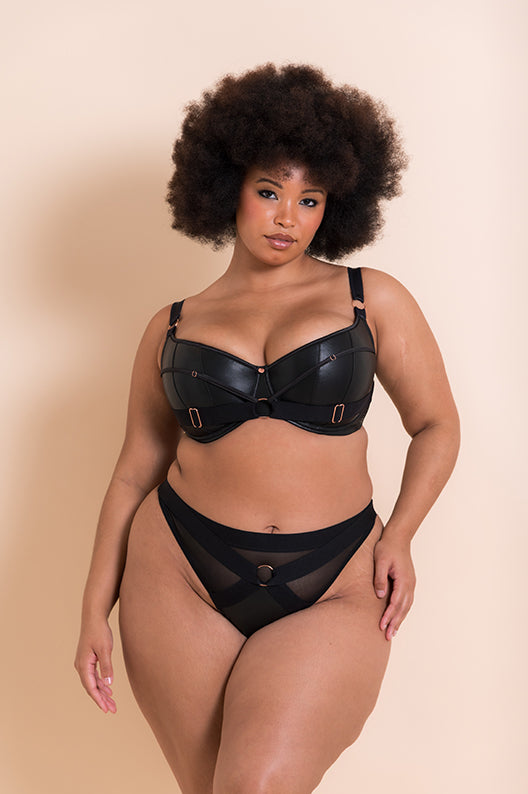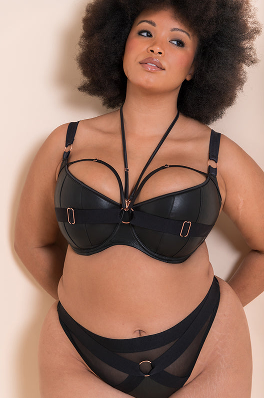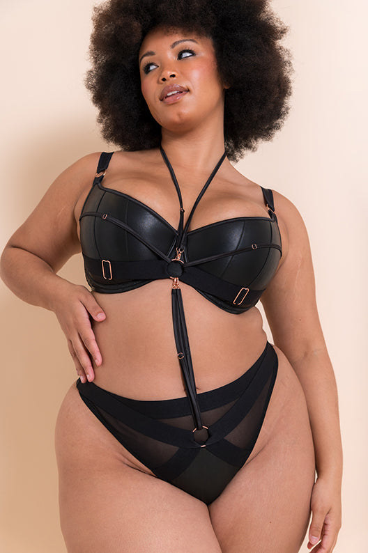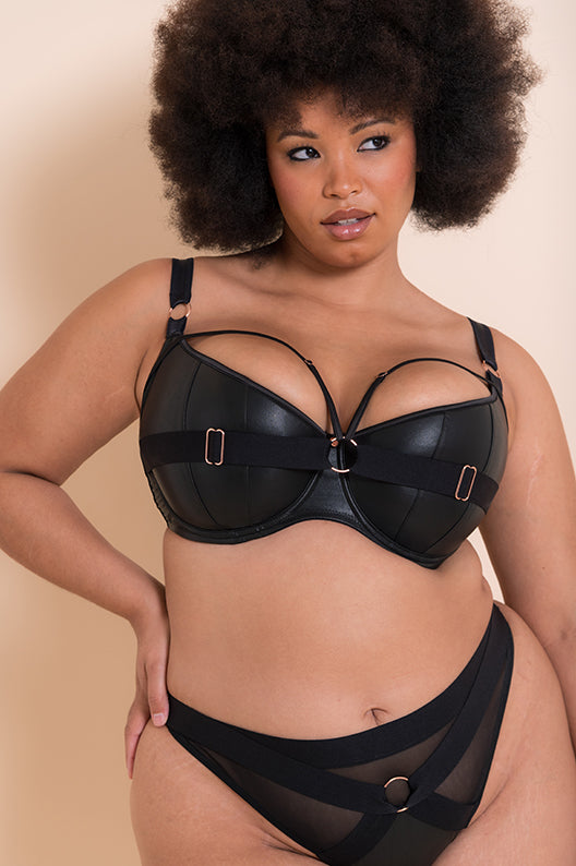 Scantilly’s most loved padded half cup bra returns by popular demand! Harnessed is back with its bondage feel in a soft, matte faux-leather outer and stunning rose gold hardware throughout. Vertical cup seams give your girls the most amazing boost and lift, while thick straps across the cup outer add dangerous, edgy vibes. Detachable satin straps can be clipped across the bra and matching thong in any way you please!